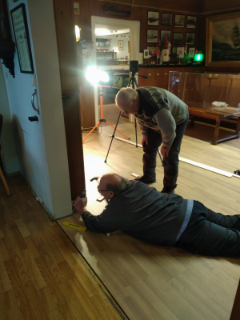 ![]() Tom Svinkerød og Spetta inspiserer det nylagte gulvet. |